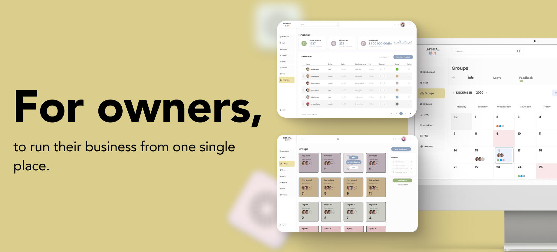 The main purpose of this platform is to help business owners stay connected with parents by having single place of communication and work presentation and help parents be even more organized, to enable them to spend more quality time with their children and to stay connected with them while they are not together.The pace of everyone’s life is faster year after year, and that is where digitization comes in play. To speed up some of the processes that are done manually, to save time and money and use it in other aspects of business to increase further growth, businesses need to recognize this as soon as possible. We are all aware of how sensitive children’s data is. Therefore, our solution is offering fully encrypted saving of data within the system. Also, all photos are be available only for app users and only upon download on their device. Importance of data safety and GDPR is recognized, and it is our highest priority.For businesses this means collecting and storing paperwork that is possible to be kept in digital format, collecting and storing children and staff info and creating schedules of activities and meals. Publishing information about child’s educational progress, interests, successes, and failures in a form of a wall posts, made possible for institutions to promote the way they work and how they use their expertise. Most importantly, sending one-way notifications to whole institution, separate groups or parents individually is supported. Importance of two-way communication is recognized so there is an option to start a chat as well. Sending feedback if child ate, slept is just a click away.For parents, this is a single app where all information about different activities children attend is collected and presented. Platform requires all desired institutions to be onboarded to the Elemental Kids. Calendar where all schedules are presented, notifications and chat with all institutions in one place, walls and image galleries, invoices and their statuses, are key features that will keep parents connected with their children even when they are separated.You can visit our landing page for more information and to book a demo.